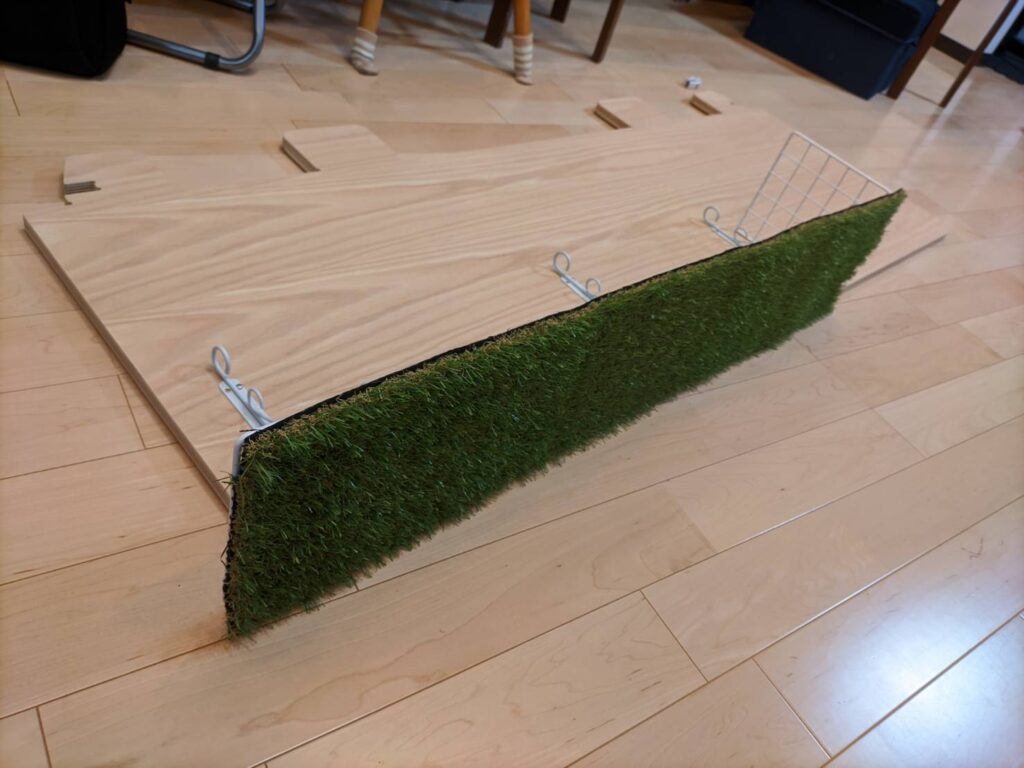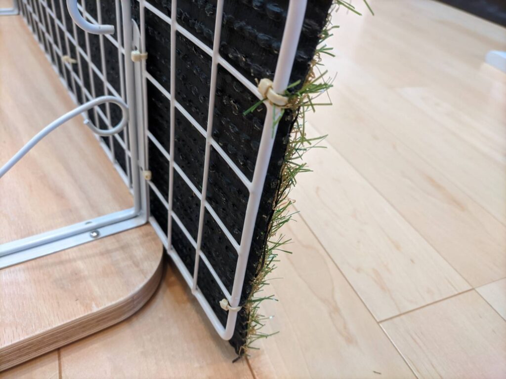 人工芝をカットし、結束バンドでワイヤメッシュと固定します